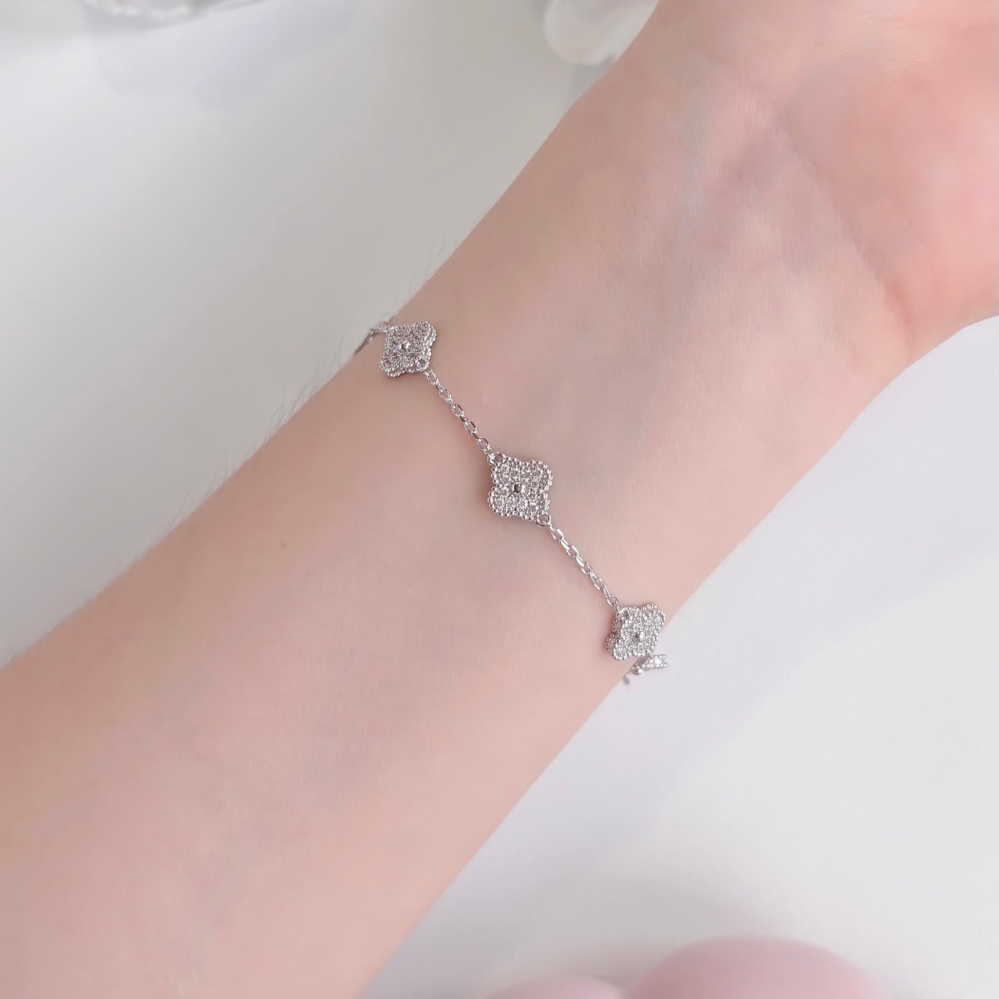 The Hailey Clover Link Chain Bracelet blends modern minimalism with timeless charm. Crafted from 925 sterling silver, it offers lasting shine and everyday durability. The delicate link chain is accented with refined clover motifs, symbolizing luck, grace, and positivity.